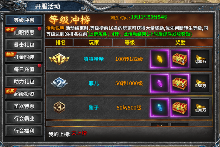 1、等級沖榜:活動結(jié)束時,等級榜前10名的玩家可獲得大量獎勵,優(yōu)先判斷轉(zhuǎn)生等級,同等級達到的排名在前