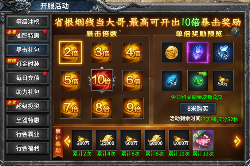 3、暴擊禮包:購買禮包可進行暴擊,最高可獲得10倍獎勵暴擊。累計購買次數(shù)達標還可獲得額外獎勵