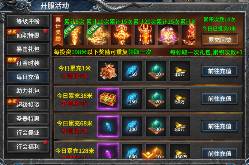 5、每日充值:使用充值卡或直購都可計算在內(nèi),累計領取次數(shù)達標可額外領取仙器獎勵。