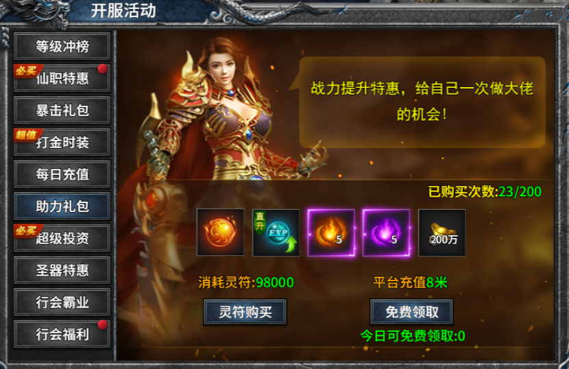 6、助力禮包:累計充值達標即可領取攻擊丹、經(jīng)驗等材料道具,也可選擇靈符購買禮包