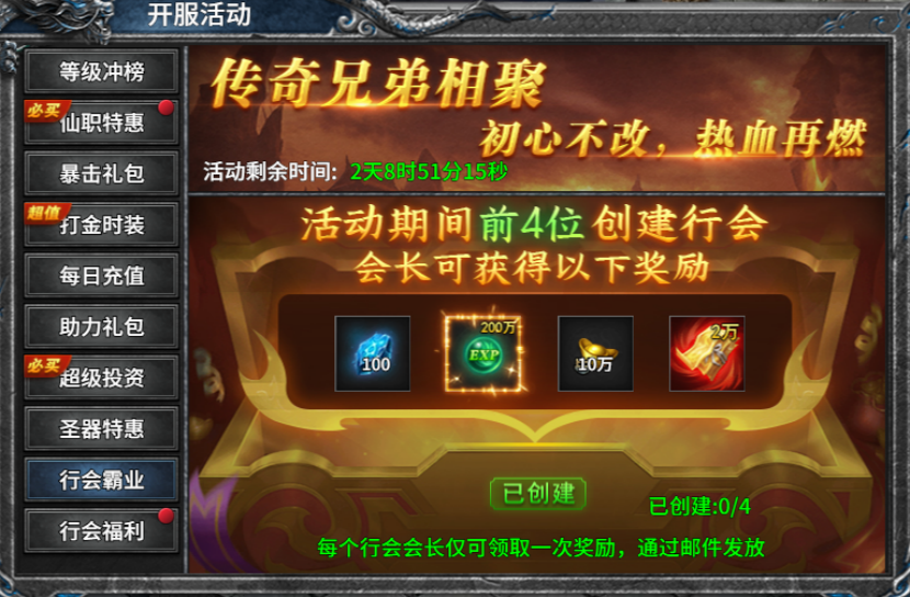 8、行會霸業(yè):開服前4位創(chuàng)建行會會長可獲得大量獎勵