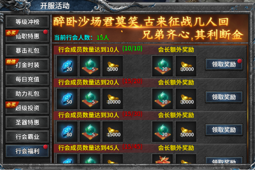 9、行會福利:行會加入人數(shù)達標 全體成員可領取獎勵,會長可額外領取獎勵