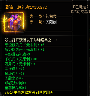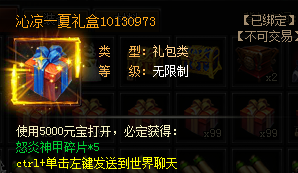 2、沁涼一夏禮盒*1(消耗5000元寶打開禮盒,必定獲得怒炎神甲碎片*5)