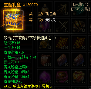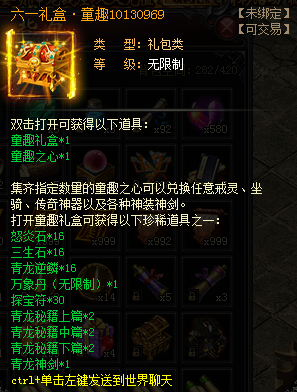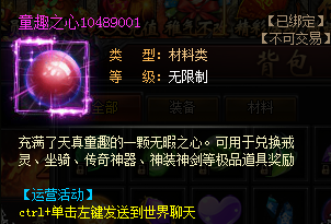 2、童趣之心*1(集齊指定數量可兌換坐騎、戒靈、傳奇神器及神劍)