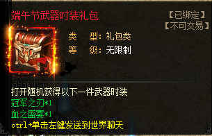 ? 線下活動期間每天單筆充值1000元,即可領取“端午節時裝禮包(衣服,武器二選一)”一個!
